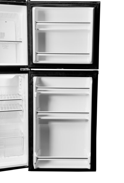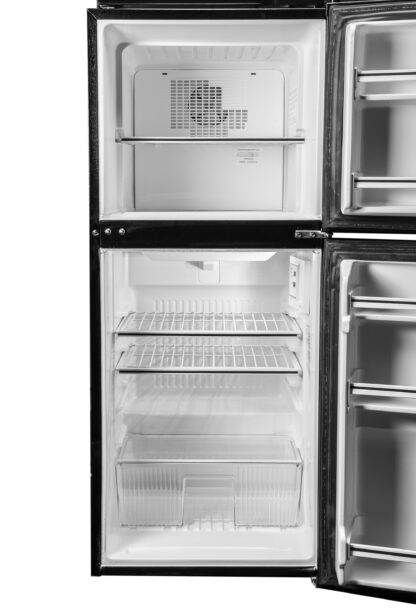 This sleek 4.8 cu. ft. capacity unit is Energy Star® rated, compact in size, and mighty on storage. The independent freezer section provides ample space for your favorite frozen foods, is automatic defrost, and frost free. The refrigerator offers tall bottle storage, a covered crisper drawer to preserve fruits and vegetables, and adjustable wire shelving to accommodate your needs. The unit comes with an attractive integrated handle, stylish tri-panel door design, and a reversible door hinge allowing you to open the fridge from the left or right side.