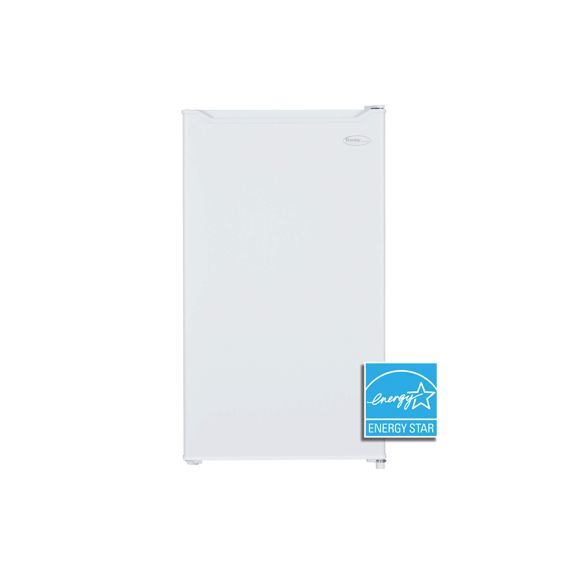 This sleek compact all-refrigerator by Danby offers 3.2 cubic feet (91 L) of refrigeration, making it ideal for lunchrooms, dorm rooms, smaller kitchens, and wet bars. There’s plenty of room for all your snacks due to the mini fridge’s two full-width and one-half-width glass shelves. All your favorite drinks can be kept cool with the tall bottle storage and mechanical thermostat. Reduce your electrical bill and save on energy with this ENERGY STAR® rated model. This small refrigerator also features a clever, reversible door hinge that enables you to adjust it for a left or right-handed opening via the integrated handle.
