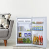 This compact fridge offers a considerable 4.4 cubic feet (125 L) of refrigeration space with a built-in full width chiller and crisper. There’s a reversible door hinge, which enables users to open the fridge left or right-handed via the integrated door handle, for any room set-up. The one-and-a-half adjustable shelves and tall bottle storage allow you to best maximize your fridge space.