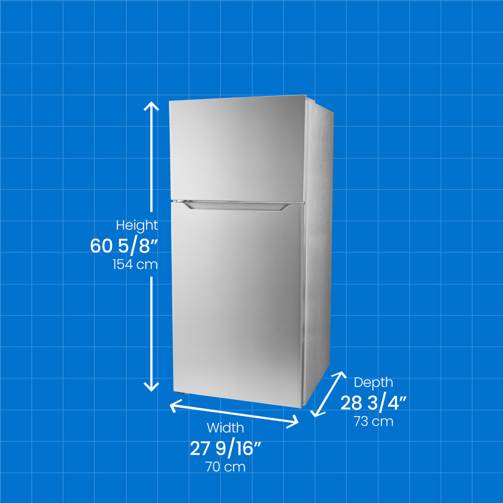 Compact and efficient, this Danby DFF142E1SSDB mid-size refrigerator is ideal for those who don't have a lot of space in the kitchen but still want all the functionalities needed to keep their food as fresh as possible. Maximize your storage space, quickly organize, and find your favourite foods with 2.5 adjustable glass shelves, 2 full-width refrigerator door shelves, 1 adjustable freezer glass shelf, 2 freezer fixed full-width door shelves, and 2-gallon bins. With manual temperature control dials and frost-free features that make preserving your frozen delicacies simple, you can skip the tedious defrosting process. In addition, your produce will last longer in the humidity-controlled crisper. Plus, bright white LED lighting keeps the inside illuminated. The reversible door hinges offer flexible layout options, and the recessed handle adds a modern touch.Specifications