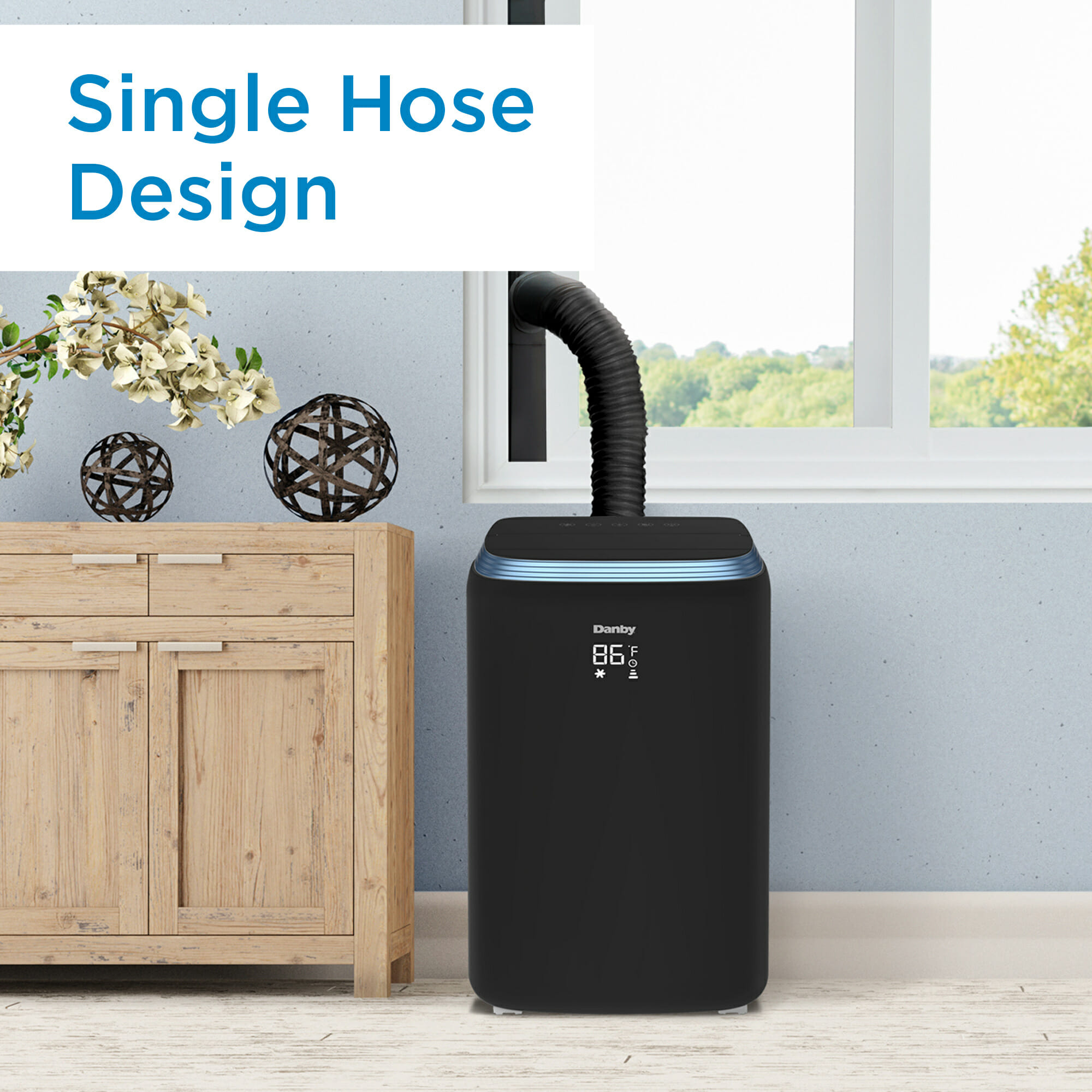 - Single hose design efficiently exhausts warm and humid air outside