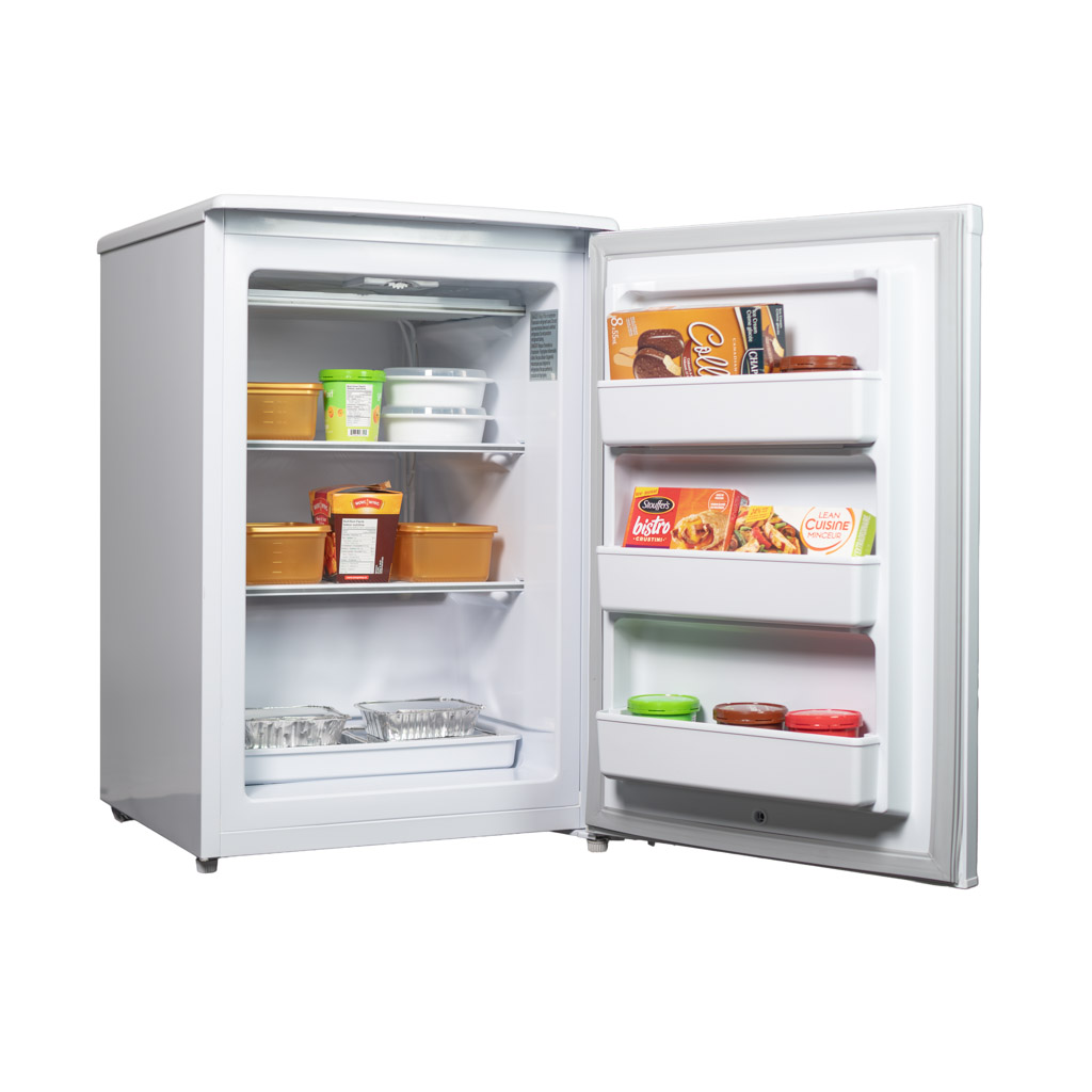 If you’re in the market for the ideal freezer for your condo, apartment, trailer, or cottage etc, your search can stop here with this superb upright model from Danby. This compact unit can provide you with 4.3 cubic feet (122 litres) of cooling and storage area without taking up too much room. Your electricity bills will also be kept in check with this efficient appliance as it comes with the prestigious Energy Star rating. There’s an abundance of interior room and organizing is made easy with the three convenient door shelves and additional pair of quick-freeze shelves. The manual defrost system makes the freezer easy to clean, and the mechanical thermostat ensures accurate temperature control. The door, which features an integrated handle, can be quickly and easily adjusted for either left or right-handed opening.  This model comes in a classy fresh white finish and boasts a scratch-resistant worktop for storing extra accessories. You’ll also find this refined freezer comes with a 5 year warranty on parts and labour with speedy in-home service